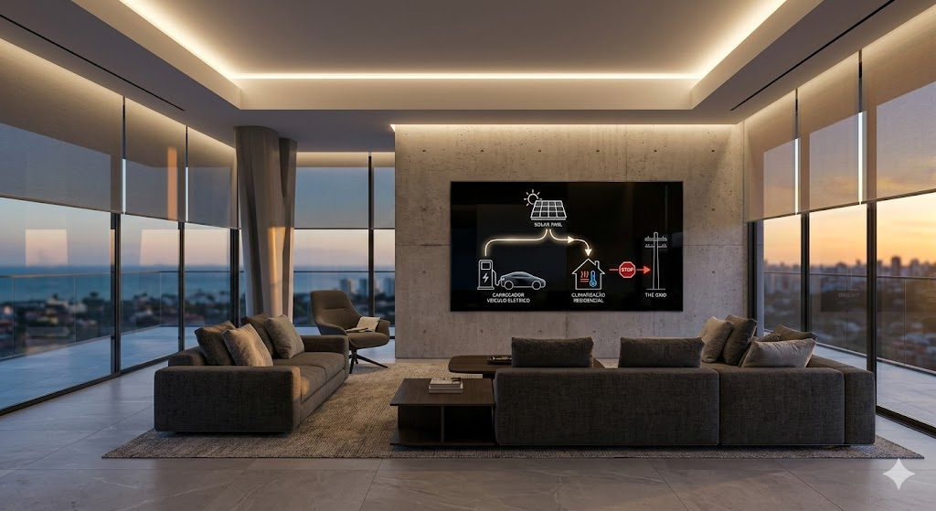 - Otimização do Autoconsumo: O sistema de automação lê os dados do inversor solar. Se for meio-dia e houver excesso de geração solar (que as concessionárias agora taxam severamente), a casa liga automaticamente o aquecedor de água, carrega o veículo elétrico ou diminui a temperatura do ar-condicionado. A energia não volta para a rede; é armazenada em forma de conforto térmico ou bateria.